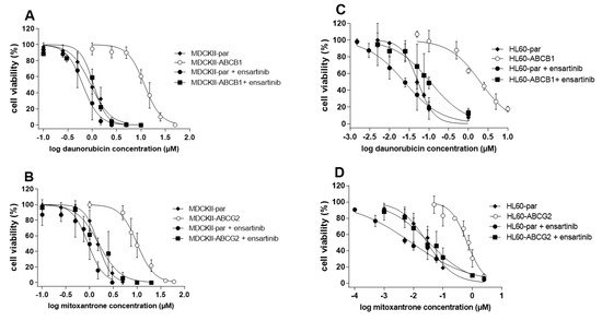 Effect of the combination of 10 µM ensartinib with daunorubicin or mitoxantrone in MDCKII-ABCB1/HL60-ABCB1 (A,C) or MDCKII-ABCG2/HL60-ABCG2 (B,D) cells, respectively. Drug-induced effects detected in the parental cell lines are shown for each variant. Cells were exposed to daunorubicin or mitoxantrone either alone or in combination with ensartinib for 48 h, after which cell viability was measured by the MTT method. The presented data are means ± SD for at least three independent experiments.