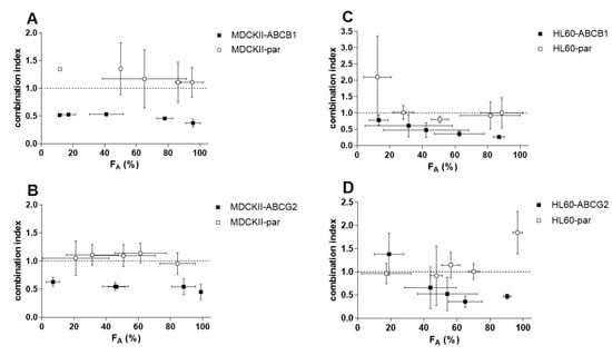 FA-combination index (CI) plot for the combinations of 10 µM ensartinib with daunorubicin or mitoxantrone in MDCKII-ABCB1/HL60-ABCB1 (A,C) and MDCKII-ABCG2/HL60-ABCG2 (B,D) cells, respectively. The results obtained with the same combinations in the parental cell lines are also shown. FA-CI plots were generated by using CompuSyn software to analyze the combination data shown in Figure 6 and ensartinib proliferation data (not shown). Combination outcomes can be synergistic (CI < 0.9), additive (0.9 < CI < 1.1), or antagonistic (CI > 1.1). The plotted data points are means ± SD from at least three independent experiments.