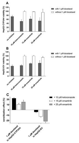 Effects of ensartinib (15 and 25 µM) and the model CYP3A4 inhibitor ketoconazole (10 µM) on the antiproliferative activity of 1 µM docetaxel in HepG2-CYP3A4 (A) and HepG2-EV (B) cells. Cells were exposed to the tested drugs alone or in tandem for 48 h, after which their viability was assessed using the MTT test. (C) Sensitization effects were computed using the data from viability measurements. Statistical analysis was performed using one-way ANOVA followed by Dunnett’s post hoc test (* p < 0.05 compared to no inhibitor). The plotted values are means ± SD for three independent experiments.