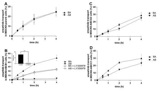 Transport of 1 µM ensartinib across MDCKII-parent (A), MDCKII-ABCB1 (B), MDCKII-ABCG2 (C), and MDCKII-ABCC1 (D) cell monolayers. LY335979 (1 µM) was used as a control ABCB1 inhibitor. Cell monolayers were exposed to ensartinib or a combination of ensartinib with a model inhibitor in the donor compartment, and sampling was performed in the acceptor chambers at selected time points. Ensartinib levels were assessed by HPLC-MS/MS. Transport ratios (r) were calculated by dividing the percentage of ensartinib transported in the BA direction by that in the AB direction 4 h after drug addition. The statistical significance of changes in r ratios in the absence/presence of the model inhibitor was analyzed using the two-tailed unpaired t-test (** p < 0.01).