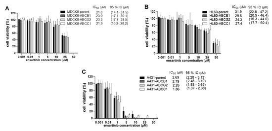 In accordance with the results of the bidirectional transport assays, no significant differences were observed between MDCKII/HL60/A431-par cells (IC50 = 21.8/31.9/2.69 µM) and the corresponding ABCG2- (IC50 = 23.3/24.3/2.26 µM) or ABCC1-overexpressing (IC50 = 21.9/27.4/1.86 µM) cells. Interestingly, although ensartinib was characterized as an ABCB1 substrate in transport experiments, it was not more effective in MDCKII/HL60/A431-par cells than in their ABCB1-overexpressing counterparts (IC50 = 23.9/29.6/2.79 µM) (Figure 10). Taken together, these results suggest that functional overexpression of ABCB1, ABCG2, and ABCC1 does not confer resistance to ensartinib.
