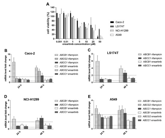 Changes in ABCB1, ABCG2, or ABCC1 mRNA levels in physiological Caco-2 and LS174T cells (B,C) and non-small cell lung cancer (NSCLC) cellular models (D,E) after treatment with ensartinib. The tested drug concentration was chosen based on the results of MTT viability experiments (A) and previously determined Cmax values. During the gene induction assays, the cells were incubated with 0.5 µM ensartinib or 25 µM rifampicin for 24 and 48 h, and the mRNA levels of target genes were evaluated by qRT-PCR. ABCG2 was not detectable in LS174T and NCI-H1299 cells. The boundaries of downregulation/upregulation positivity based on the EMA’s recommendations are indicated by dotted lines. The plotted data are means ± SD from at least three independent experiments.