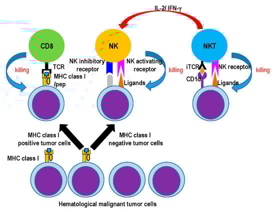 As the effector types of innate lymphocytes, natural killer (NK) cells, natural killer T (NKT) cells, mucosa-associated invariant T (MAIT) cells, and γδ T cells play an important role in immune surveillance against infectious and tumor diseases [4,5]. NK cells are one of the most important populations in the innate immune response and play a pivotal function in cancer immune surveillance. NK cells usually express inhibitory and activating receptors, and they eliminate a variety of abnormal or stressed cells, tumor cells, and infected cells after recognition of target cells [6] (Figure 1). NKT, γδ T, and MAIT cells belong to the family of unconventional T cells. Intriguingly, antigen recognition by these unconventional T cells is not restricted to MHC class I and II molecules [4]. In relation to the anti-tumor response, NKT cells are also well characterized. NKT cells are ordinarily categorized as types I and II [7,8]; type I NKT cells are known as semi-invariant NKT cells (iNKT) as they express a canonical, semi-invariant T cell receptor (TCR), whereas type II NKT cells have a diverse TCR repertoire. Both type I and II NKT cells recognize glycolipid antigens on the CD1d molecule, but their functions in tumor immunity clearly differ [9] (Figure 1). Type I NKT (iNKT) cells are relatively abundant in mice (~1% of T cells), whereas their frequency in humans is low (0.01–0.1% of T cells) [4,7]. γδ T cells lack CD4 and CD8 expression. In human peripheral blood (PB) or lymphoid tissues, 0.5–16% of all CD3+ cells is represented by γδ T cells, in which the Vγ9+Vδ2+ subset is the most dominant in circulation and can respond to small, phosphorylated metabolite antigens [10]. In contrast, the percentage varies between 1% and 4% in mice [4]. MAIT cells belong to another discrete subpopulation of unconventional T cells that are characterized by a limited TCR repertoire. In contrast to NKT cells, MAIT cells are abundant in humans but to a much lesser extent in mice. Most human MAIT cells express an invariant α chain (Vα1.2-Jα33) paired with a limited subset of TCRβ chains (Vβ6 and Vβ2) and recognize vitamin B metabolite antigens presented on the MHC-I related molecule MR1 [4,11]. Such effector-type innate lymphocytes share several common characteristics to some extent, e.g., the secretion of interferon-γ (IFN-γ) and tumor necrosis factor α (TNFα) upon interaction with the ligand or antigen; however, their location, subset, and function differ. Here, we review the role of iNKT and NK cells in the anti-tumor response, particularly in hematological disorders, by highlighting that innate immune cells detect tumors, exert effector functions, and amplify adaptive immune responses. Moreover, we introduce the attempts made to manipulate innate immune responses in cancer.