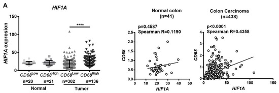 2.1. CD68 and HIF1A Are Positively Correlated in Colon Cancer Patients, and the Population CD68HighHIF1AHigh Presents Better Prognosis
