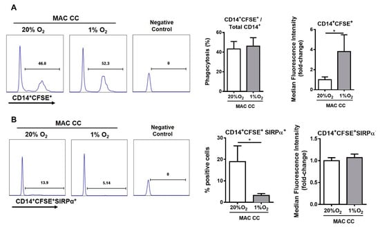 In the present study, we exploited whether hypoxia alters macrophage phagocytic activity, in a similar process already described in breast cancer [12], using hypoxic cancer cells as a phagocytic stimulus. Accordingly, macrophages were co-cultured with cancer cells for 72 h at 20% or 1% O2 (Figure S1A). Then, cancer cells were removed, and macrophages were directly stimulated with CFSE (Carboxyfluorescein Diacetate Succinimidyl Ester)-labeled cancer cells, previously cultured at 1% O2 for 72 h. Although no differences were observed in the percentage of phagocytic macrophages, the amount of phagocyted CFSE-labeled cancer cells almost doubled on macrophages pre-conditioned by hypoxia and cancer cells (Figure 3A and Figure S2A,B). Afterwards, we explored alterations in SIRPα levels in the phagocytic macrophages, those engulfing CFSE+ cancer cells (CD14+CFSE+). Interestingly, we found a significant decrease in the percentage of phagocytic macrophages expressing SIRPα, when previously maintained at 1% O2 in comparison to those at 20% O2 (Figure 3B and Figure S2A,B). Based on these results, we further analyzed the SIRPα expression in macrophages and CD47 in cancer cells from the indirect co-cultures, maintained for 72 h at 20% or 1% O2, before the direct contact with the CFSE-labeled cancer cells. Notably, we found that the co-cultures were already sufficient to trigger a decrease in macrophage SIRPα (Figure 3C), and an increase in cancer cells CD47 (Figure 3D).