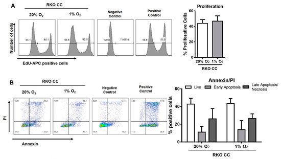 No differences were observed in both cell proliferation and cell death in cancer cells when co-cultured with macrophages at 20% or 1% O2 (Figure 5A,B).