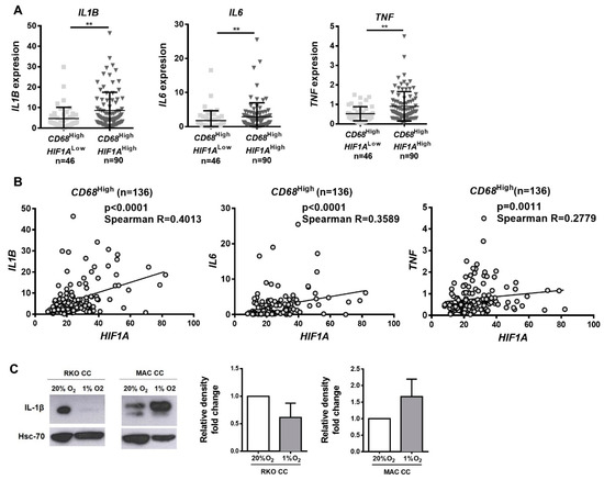 CD68HighHIF1AHigh tumors present increased expression of pro-inflammatory cytokines and increased infiltration of cytotoxic T-cells. RNASeq expression data were downloaded from TCGA. (A) The expression of IL1B, IL6, and TNF was evaluated within the CD68High population, between HIF1ALow and HIF1AHigh, according to the median levels of CD68 and HIF1A expression in normal samples. (B) The correlation between IL1B, IL6, TNF, and HIF1A was assessed within the CD68High population. (C) IL-1β protein levels were evaluated in total lysates from co-cultured RKO cells (RKO CC) and macrophages (MAC CC), by Western blot, and band densitometry quantification presented. Hsc70 was used as loading control, and the figure is representative of 3 independent experiments. (D) The expressions of NCAM1, CD8A, and TBX21 were evaluated within the CD68High population, between HIF1ALow and HIF1AHigh subpopulations, according to the median levels of CD68 and HIF1A expression in normal samples. NCAM1 levels were evaluated within the CD3DLow population, CD8A levels were evaluated within the GZMBHigh population, and TBX21 levels were evaluated within the IFNGHigh population. CD3DLow, GZMBHigh, and IFNGHigh populations were established according to the median levels of each marker expression in normal samples. (E) Correlations between NCAM1(CD3DLow), CD8A(GZMBHigh), and HIF1A were assessed within the CD68High population. Mann–Whitney statistical test was used to compare expression between groups. Spearman statistical test was used to assess correlation, which was considered moderate positive when Spearman Rs were between 0.2500 and 0.3500, and strong positive when Spearman R > 0.3500. **** p < 0.0001; *** p < 0.001; ** p < 0.01; * p < 0.05. The p-values between 0.05 and 0.1 were presented and considered a tendency.