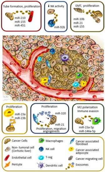 In solid tumors, cancer cells are surrounded by an extracellular matrix (ECM) that supports the tumor vasculature and a wide-range of cells, including cancer-associated fibroblasts (CAFs), lymphocytes, myeloid cells, and others, which coexist in a dynamic and adaptive environment [1]. Interactions among different cell populations often have a tumor-promoting role, fostering cancer cell growth from the initial phases of carcinogenesis. This supportive environment is maintained by a complex network of intercellular communications driven by cytokines, chemokines, growth factors, and extracellular vesicles (EVs). EVs are now emerging as one of the key players in the cell-to-cell mechanisms since they are able to deliver multiple and complex information to recipient cells [2]. Among the different types of EVs produced by cancer cells, such as microvesicles and large oncosomes, exosomes represent a widely studied class; they are disc-shaped vesicles ranging from 30–150 nm in size, and contain a molecular cargo consisting of proteins, lipids, and nucleic acids [3,4]. One particular class of non-coding RNAs in the exosomal cargo is represented by microRNAs (miRNAs), short non-coding RNAs (19–22 nt) usually involved in the regulation of the cellular pathway in both physiological and pathological conditions, including cancer [5]. Recent evidence highlights the capacity of exosomal miRNAs to regulate molecular pathways in recipient cells, thus affecting many aspects of tumorigenesis and tumor progression, such as angiogenesis, immune-escape, epithelial-to-mesenchymal transition (EMT), invasion, and multi-drug resistance. These aspects have also been also explored in hepatocellular carcinoma (HCC), which is now one of the deadliest cancers worldwide [6]. Because of the heterogeneity of the disease, both in terms of molecular alterations and cell populations constituting the so-called tumor microenvironment (TME), it has become of great importance the understanding of the complex exosome-mediated cell-to-cell communication networks in order to elucidate the mechanism fostering tumor cell growth. In this review, we summarize the recent findings on the role of the exosome-derived miRNAs in the cross-communication between tumor cells and different hepatic resident cells, focusing on the molecular mechanisms responsible for the cell re-programming. In addition, we describe the clinical implication derived from the exosomal miRNA-driven immunomodulation to the current immunotherapy strategies and the molecular aspects influencing the resistance to therapeutic agents.