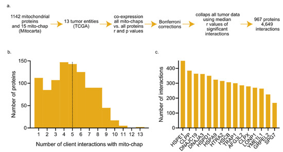 (a) Workflow scheme. (b) Distribution of the number of interactions with chaperones, dashed line depicts the median number of interactions per protein. (c) The number of interactions of each mitochondrial chaperone (mito-chap).