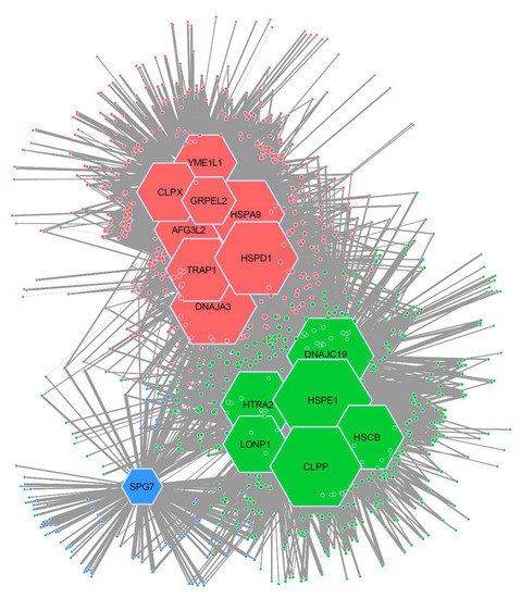 We used our co-expression data to build the CCI network and to infer its topology. To this end, we performed community detection analysis (Figure 2) and found that our network is non-random (Figure S4). Specifically, the network has a non-random modular structure (p-value < 0.001) composed of three distinct modules. Each module is comprised of chaperones and clients that are co-expressed more strongly with each other than with chaperones or clients from other modules. We named these modules HSPD1, HSPE1, and SPG7, and marked them as red, green, and blue in Figure 2, respectively. Module HSPD1 is comprised of eight chaperones and 422 clients. Module HSPE1 is comprised of six chaperones and the largest number of clients (451). SPG7 is the smallest module with 94 clients and only one chaperone. The remaining 176 proteins could not be associated with any module due to a lack of co-expression with any of the chaperones.