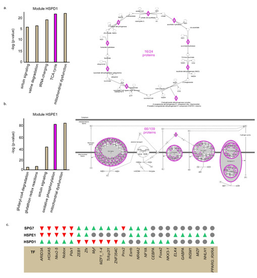 Proteins in each module are enriched for distinct mitochondrial pathways and distinct transcription factor motifs in their promoters. a, b. proteins belonging to each module were interrogated using Ingenuity Pathway Analysis (IPA) to identify biological pathways enriched in each list of proteins. (a) Module HSPD1 (b) Module HSPE1. (c) Transcription factor binding sites enriched or depleted in each module were identified using oPOSSUM analysis. Green = enriched in the module; Red = depleted in the module; Gray = not enriched or depleted in the module.