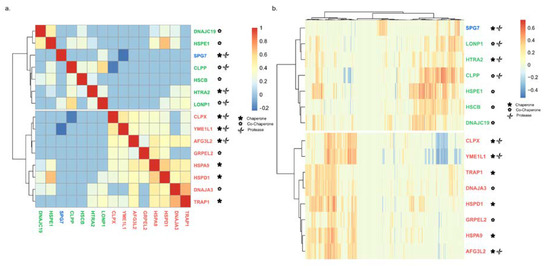 We noted that the two major groups in our hierarchical clustering (Figure 4a) are similar in composition to the network modules HSPD1 and HSPE1 that were obtained through the co-expression analysis of chaperones with 1142 transcripts (Figure 2). Yet, SPG7 was clustered differently from its position in the network module. We wondered to what extent the chaperone–chaperone co-expression hierarchical clustering is maintained in chaperone–client co-expression hierarchical clustering (Figure 4b). In accord with our chaperone–chaperone co-expression analysis (Figure 4a), we found that the chaperones are separated into two similar major groups (Figure 4b). Therefore, we conclude that the information found in the chaperone–chaperone co-expression network is sufficient to generate the two major groups obtained using chaperone–client co-expression analysis.