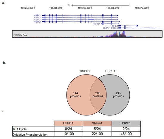 In bacterial genomes, genes encoding GroEL and GroES are placed under the same operon, ensuring co-expression. In the human genome, HSPD1 and HSPE1 are found in a head-to-head orientation and share a bi-directional promoter [47], as indicated by the histone 3 lysine 27 acetylation (H3K27ac) pattern (Figure 5a). As expected, the expression of the two genes is highly correlated (Figure 4a). Surprisingly, HSPD1 and HSPE1 are co-expressed with different sets of mitochondrial proteins (Figure 4b) and mito-chaperones (Figure 4a). We compared the list of genes co-expressed with each chaperonin and found that 206 proteins are co-expressed with both chaperones, 144 are co-expressed only with HSPD1, and 245 are co-expressed only with HSPE1 (Figure 5b, Table S4). Using IPA, we found that proteins co-expressed with HSPD1 or HSPE1 belong to different mitochondrial pathways. Namely, tricarboxylic acid cycle (TCA) cycle enzymes are mostly co-expressed with HSPD1, while oxidative phosphorylation (OXPHOS) proteins are mostly co-expressed with HSPE1 (Figure 5c). These findings are in line with the results obtained using network analysis, where HSPD1 and HSPE1 are found in distinct modules (Figure 3). Together, these findings suggest that HSPD1 might support the folding of TCA cycle proteins, whereas HSPE1 assists in the targeting and folding of OXPHOS proteins.