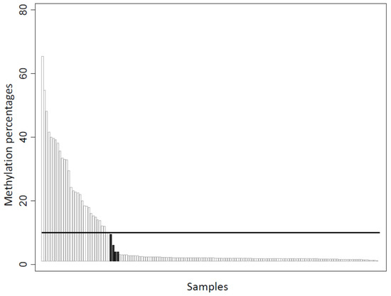 Correlation between methylation-specific PCR and EpiTYPER® MassARRAY® methylation evaluation (n = 153). Black columns indicate discordant cases (n = 4, methylation percentage assessed by MassARRAY® = 9.5, 6, 4, and 4), using a positivity cut-off of 10%.