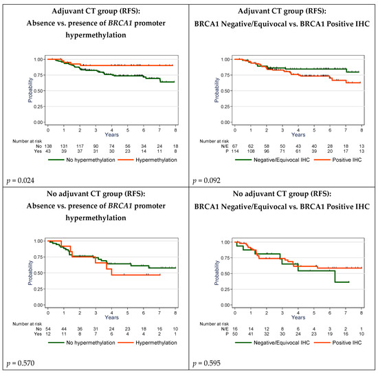 Using the Kaplan–Myer survival curves (Figure 4), adjuvant CT benefit seemed to be restricted to the group of patients with BRCA1-deficient tumors; there was a significant difference between the prognosis of patients affected by an hypermethylated tumor (p = 0.024) under adjuvant CT, without difference in patients that did not received adjuvant CT (p = 0.570). A trend was seen for adjuvant CT-treated patients in case of BRCA1 negative/equivocal tumors by IHC (p = 0.092), without difference in patients that did not received adjuvant CT (p = 0.595). In addition, the independent prognostic information delivered by multivariate analysis of BRCA1 promoter hypermethylation status, and not of IHC-assessed BRCA1 expression, which was also associated with a number of unclassified tumors using the Garg and Meisel criteria (17%), favors the consideration of BRCA1 promoter hypermethylation status in this TNBC population (Table 3).