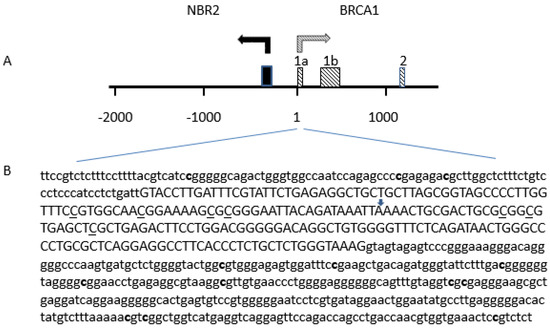 Distribution of CpG sites analyzed in the promoter region of the BRCA1 gene. (A) The BRCA1–NBR2 locus: the position of the first exons of the BRCA1 is indicated by shaded boxes. The first exon of NBR2 gene is indicated by a black box. (B) Position of CpG sites analyzed Cytosine on CpG sites tested by MS-PCR are underlined. Cytosine on CpG sites tested by MassARRAY® EpiTYPER® assay are in bold. The positive strand of the BRCA1 gene is shown based on GenBank accession number U37574. The transcription start site of the BRCA1 exon 1A is marked by an arrow. Exon 1A sequence is in capital, and both 5’upstream sequence and intron 1 sequence are in lower case characters.