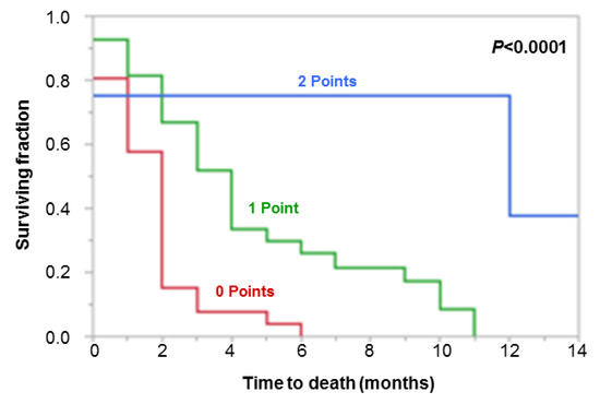 Of the 20 patients who had liver metastases, no patient survived longer than 5 months. Thus, the probability of dying within 6 months was 100%. In patients without liver metastases, 6-month survival rates were 0% (0 of 13 patients) in the 0-points group, 35% (7 of 20 patients) in the 1-point group, and 75% (3 of 4 patients) in the 2-points group, respectively. The PPVs were 100% and 75%, respectively, to correctly predict death within 6 months and survival for at least 6 months.