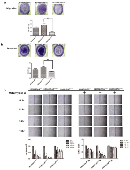 To minimize effects caused by genetic background heterogeneity, we used a series of three isogenic lung cancer cell lines, namely, H838KRASWT, H838KRASG12V and H838KRASG12D (Figure S1a–c). First, we observed obvious morphology changes in H838KRASG12D cells by immunofluorescence (IF) staining of F-actin. The smaller cell size and more microspikes were observed in H838KRASG12D cells than H838KRASWT and H838KRASG12V cells (Figure 1a). However, the KRASG12V and KRASG12D did not affect cell proliferation (Figure 1b). To differentiate the distinct impact of KRASG12V and KRASG12D mutations on cell functional effects, several cell functional assays were performed. The H838KRASG12V cells showed a greater ability of colony formation than H838 KRASG12D cells (Figure 1c, * p < 0.05 and ** p < 0.01). The mutation of KRASG12V conferred greater abilities of migration (Figure 2a, ** p < 0.01) and invasion (Figure 2b, ** p < 0.01) than KRASG12D mutation. To clarify the effect of migration and proliferation, cells were treated with a proliferation blocker Mitomycin C (10 μg/mL). The cells with KRASG12V mutation improved the ability of wound healing even after treatment with Mitomycin C (Figure 2c). Together, these findings suggest that KRASG12V and KRASG12D mutations might affect cell functions related to metastasis but not cell proliferation.