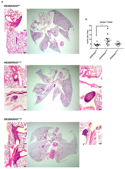 Next, we established a murine metastasis model to assess the metastatic potential of KRAS mutations in Vivo. The H838 isogenic cells were injected into the nude mice through tail vain. The lung tissues of mice were removed after 140 days injection and immediately preserved in 10% formalin. We further performed a histopathological examination of the formalin-fixed lung tissues to confirm the presence of micrometastases. The KRASG12V mutation induced a greater amount of micrometastases in mice lung tissues (Figure 3a) and the results showed statistical significances compared to KRASWT (Figure 3b, * p < 0.05). Thus, these data show that KRAS mutations are capable of different metastatic potential and KRASG12V mutation confers a more aggressive phenotype.