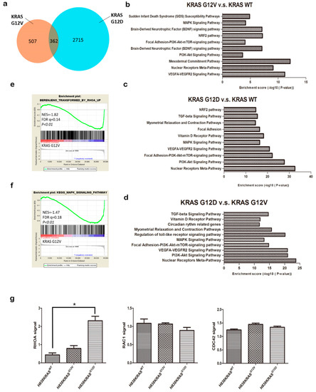 Microarray analysis of differentially regulated genes between H838 KRASG12V and KRASG12D cells. (a) Venn diagram representing the number of genes that was differentially expressed in H838 KRASG12V and KRASG12D cells with a fold change of 2.0 and a false discovery rate of 0.05. (b) Number and categories of genes up- and downregulated in H838 KRASG12V cells. (c) Number and categories of genes up- and downregulated in H838 KRASG12D cells. (d) Number and categories of genes up- and downregulated in H838 KRASG12V vs. H838 KRASG12D cells. The number of genes expressing a twofold or greater significant difference (p ≤ 0.05) is plotted for the listed categories. (e) The correlation between RhoA pathway and KRASG12V by Gene Set Enrichment Analysis (GSEA). (f) The correlation between MAPK pathway and KRASG12V by GSEA. The normalized enrichment score (NES) and p value are shown. (g) The activation of Rho GTPase family proteins (RhoA, Cdc42, and Rac1) in H838 KRAS isogenic cell lines was evaluated by G-LISA assays. The values represent the means ± s.d. of five independent assays (n = 5, * p < 0.05 and ** p < 0.01).