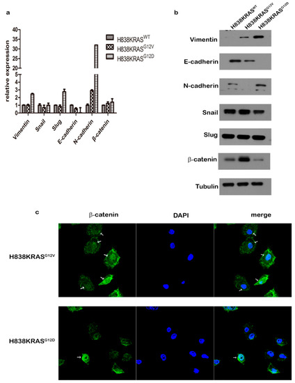 Cancer metastasis is the highest cause of cancer related death. The epithelial-mesenchymal transition (EMT) process is a well described mechanism of metastasis that confers migratory and invasive properties or stem cell-like features that allow cells to disseminate from primary sites to secondary sites by releasing into blood or lymph vessels. Due to the differential capacity of migration in our results, we evaluated the expression profiling of EMT markers in these isogenic cells. We found that the KRASG12D mutation downregulated the expression of E-cadherin and upregulated the expression of N-cadherin at the RNA level (Figure 5a). In protein level of EMT markers, KRASG12V mutation increased the expression of vimentin and β-catenin but decreased the expression of E-cadherin and N-cadherin. In contrast, KRASG12D mutation promoted the expression of vimentin and N-cadherin but abolished the expression of E-cadherin (Figure 5b).