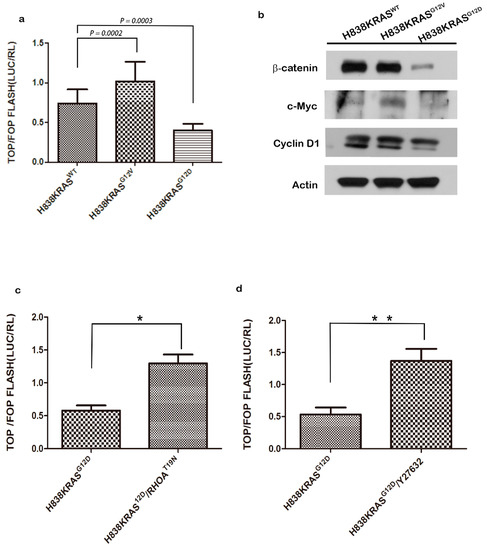 As has been previously reported, inactivation of RhoA may promote the translocation of β-catenin into nucleus and increase the size and number of adenomas in colon cancer [43,44]. To dissect the regulatory correlation of RhoA and Wnt/β-catenin, we performed immunoblotting and observed a slightly increased total of β-catenin after treatment with Y23762 (RhoA inhibitor) in H838 KRASG12D cells (Figure S6). To define the direct correlation between RhoA and activation of β-catenin, we transduced dominant-negative form of RhoA (RhoAT19N) into these cells or treated cells with Y23762 treatment. The results showed that H838KRASG12D cells exhibited an approximately threefold restoration of Wnt/β-catenin activation after introducing RhoAT19N (Figure 6c, * p < 0.05). We also observed a nearly threefold restoration of β-catenin activation after treated H838KRASG12D cell with Y23762 (Figure 6d, ** p < 0.01). Collectively, our findings prove the correlation of KRAS/RhoA/β-catenin and RhoA act as a directly upstream regulator of Wnt/β-catenin signaling.