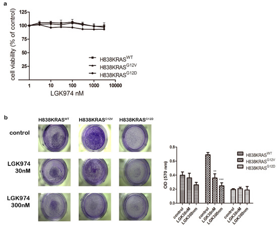To determine the effect of Wnt pathway on cell proliferation, we performed cell proliferation assays under Wnt inhibitor (LGK974) treatment and found that LGK974 had no effect on cell viability (Figure 7a). Second, to evaluate inhibitory effects of cell migration under LGK974 treatment, we treated H838KRASG12V cells with 30 nM and 300 nM of LGK974 and then performed migration assays. The results of migration assay showed that both 30 nM and 300 nM of LGK974 restricted migration ability of H838KRASG12V cells and the inhibitory effect achieved statistical significance (Figure 7b, * p < 0.05 and ** p < 0.01). To further prove the inhibitory effect of LGK974 on other KRAS-mutant NSCLC cells, we tested several KRASG12V mutant NSCLC cells (RERF-LC-AD2, H2444, H441) and KRASG12D mutation cells (SK-LU-1) (Figure S7a,b). The result indicated that the treatment of 20 nM LGK974 inhibited migration ability of RERF-LC-AD2 and H441 (* p < 0.05) and slightly inhibit migration ability of H2444 (Figure S8a–c). In contrast, the treatment of 20nM LGK974 promoted migration ability of SK-LU-1 (* p < 0.05) (Figure S8d). Together, these data support the idea that Wnt/β-catenin pathway has potent effects on migration in KRASG12V-mediated metastasis.