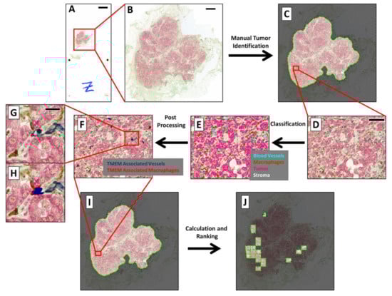 Algorithm for performing automated Tumor MicroEnvironment of Metastasis (TMEM) doorway analysis and scoring on whole scanned slides: Automated identification of TMEM doorway in immunohistochemical(IHC)-stained slides requires several steps applied at different magnifications. (A) Digitized whole slide captured on the 3DHistech Pannoramic P250 slide scanner. Bar = 5000 µm. (B) Zoomed-in region of just the tissue. Bar = 1000 µm. (C) Pathologist identification of invasive tumor by drawing a region of interest (ROI) separating and masking off the tumor tissue from the surrounding stroma. (D) A 40× equivalent zoomed-in field-of-view within the tumor area. Bar = 100 µm. (E) Classification of each pixel as either a blood vessel (cyan), a macrophage (brown), a tumor cell (pink), or stroma (uncolored). (F) Identification of TMEM doorways highlights the TMEM-associated vessels in dark blue and the TMEM-associated macrophages in red. (G) Zoomed-in view of one identified TMEM doorway from Figure 1F. Bar = 20 µm. (H) Same as Figure 1G with the overlay indicating the TMEM-associated vessel (dark blue) and TMEM-associated macrophage (red). (I) Image of the whole tissue after application of both the tumor identification and TMEM identification algorithms. (J) The top 10 scoring fields are highlighted by the TMEM ranking algorithm.