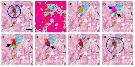 Figure 2. Morphometric analysis and identification of TMEM doorways: (A) A representative field of view containing one TMEM doorway (circled). Tissue is stained for Pan-Mena-overexpressing tumor cells (pink), macrophages (brown), and endothelial cells (blue). Bar = 15 µm (B) A linear Bayesian classifier identifies each pixel as belonging to one of five different categories: blood vessels (cyan), macrophages (brown), lightly stained tumor cells (pink), darkly stained tumor cells (red), or background and stroma (gray). (C) Contiguous groups of pixels with the same class are treated as objects which are then subjected to image processing steps to smooth boundaries and filter of small and large objects, leaving macrophages (orange), vessels (cyan), tumor (label not shown in figure), and stroma/background (label not shown in figure). (D) Morphometric analysis allows the reclassification of macrophages and vessels as macrophage–vessel complexes (magenta, blue arrow) and vessel–macrophage complexes (green, black arrow) according to their degree of boundary contact (black line). (E,F) Further morphometric analysis identifies macrophage–vessel complexes and vessel–macrophage complexes with prespecified boundary contacts with tumor cells as TMEM-associated macrophages (red) and TMEM-associated vessels (dark blue), respectively. (G) TMEM-associate macrophages and TMEM-associated vessels are isolated from all other structures and considered TMEM objects. (H) TMEM objects are then marked by expanding the size of the TMEM-associated vessels by 140 pixels (50 µm) to generate a circle resembling those utilized by the pathologists during manual scoring. - 4.