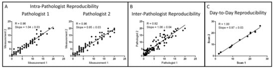 Summary of algorithm reproducibility tests: (A) Intra-pathologist reproducibility evaluated by comparison of TMEM scores from 100 different images manually generated by two different pathologists on two different days. (B) Inter-pathologist reproducibility evaluated by comparison of the average TMEM scores from Figure 3A for each pathologist. (C) Day-to-day reproducibility of the combined scanning algorithm performance using 12 cases scanned and evaluated on different days.