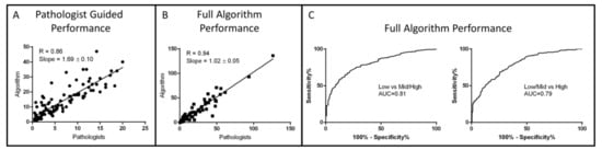 Performance of the algorithm was evaluated in three different ways: First, the algorithm’s ability to score TMEM doorways (“pathologist guided analysis”) was evaluated by processing with the algorithm the same 100 fields of view that were utilized to assess the inter- and intra-pathologist reproducibility. For this analysis, algorithm scores were directly compared to the average of scores generated by the two pathologists independently. Correlation and concordance between the pathologists’ average scores and the algorithm generated scores were high with a Pearson R = 0.86 (Figure 4A) and area under the curve (AUC) of 0.90 and 0.96 when comparing tertiles (low vs mid/high scores and low/mid vs high scores).