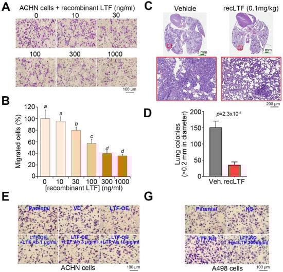 LTF inhibits the metastatic potential of ccRCC cells. (A,B) Giemsa staining (A) and histogram representing data from three independent experiments (B) analyzing migrated cells in the 3-h Transwell assay for ACHN cells pretreated with recombinant LTF (recLTF) protein at the indicated concentrations for 24 h. (C) Hematoxylin/eosin staining of lung tissues derived from mice post-transplantation with ACHN cells for 4 weeks without (vehicle, PBS) or with the administration of recLTF at 0.1 mg/kg twice a week. The red regions indicate the colonies of ACHN cells. Scale bars in the upper and lower pictures denote 3 and 0.2 mm, respectively. (D) Boxplot for the lung tumor colonies (>0.2 mm in diameter) counted from tumor-bearing mice (n = 5) as shown in C. Nonparametric Mann–Whitney U test was used to estimate statistical significance. (E,F) Giemsa staining (E) and histogram representing data from three independent experiments (F) analyzing migrated cells after a 2-h Transwell assay in parental and vector control ACHN cells and LTF-OE ACHN cells pretreated without or with LTF antibody (Ab) at the designated concentrations for 24 h. (G,H) Giemsa staining (G) and histogram representing data from three independent experiments (H) analyzing migrated cells after a 3-h Transwell assay in parental and vector control A498 cells and LTF-silencing (LTF knockdown, LTF-KD) A498 cells pretreated without or with recLTF protein at 300 ng/mL for 24 h. The different letters in each column of F and H indicate statistical significance at p < 0.05 as determined by the Friedman test.
