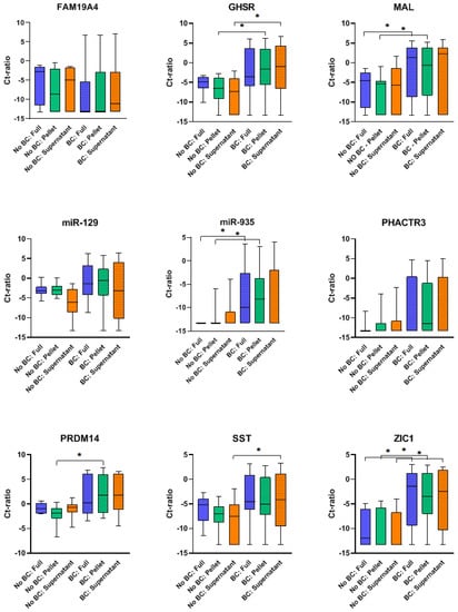 Both BC patients and hematuria controls were included to determine the discriminative capability of the methylation markers in the different urine fractions for BC diagnosis. In Figure 1, methylation levels of all nine methylation markers in each urine fraction are displayed for BC patients and hematuria controls. In full void, methylation levels of MAL, miR-935 and ZIC1 were significantly higher in BC patients than in hematuria controls. For urine pellet, GHSR, MAL, miR-935, PRDM14 and ZIC1 had significantly higher methylation levels in BC patients. In urine supernatant, methylation levels of GHSR, SST and ZIC1 significantly differed between BC patients and hematuria controls.