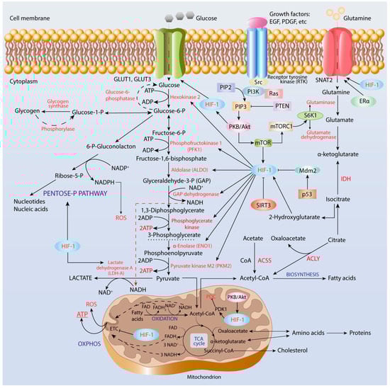 With the use of the tumor metabolism modeling approach, it has been shown that in the hypoxic microenvironment, both intracellular and environmental factors contribute to metabolic reprogramming of cancer cells, and that various growth factor-initiated cell signaling cascades and transcription factors can affect HIF-1 activity [39]. An interplay between HIF-1 and a variety of oncogenes such as Ras, c-Myc, p53, AMPK, along with PKB/Akt, PI3K, and mTOR signaling pathways has been observed to control mitochondrial ETC functioning and energy production to maintain cancer cell proliferation and survival [40,41,42,43,44,45,46,47].