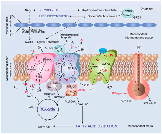 In addition to ATP production, mitochondrial ETC serves as a primary endogenous source of ROS (Figure 2) and generates superoxide anion radicals in large amounts, although they are generated as a byproduct rather than a primary product [212,213]. ROS generation by mitochondrial ETC results from leak of electrons and incomplete reduction of molecular oxygen to yield O2•−. In addition to well-recognized ETC sites of ROS generation, enzymatic complexes I and III, mitochondrial FAD-dependent glycerol-3-phosphate dehydrogenase (GPD2), and a system of electron transfer flavoprotein and electron transfer flavoprotein: ubiquinone oxidoreductase (ETF/ETF:QO system) have been identified. GPD2 is involved in the glycerolphosphate shuttle mechanism to carry reducing equivalents produced in glycolysis by cytoplasmic glyrerol-3-phosphate dehydrogenase (GPD1) through the outer mitochondrial membrane to ETC located in the inner mitochondrial membrane [214]. The ETF/ETF:QO system is involved in transferring of electrons from 11 different mitochondrial flavoprotein dehydrogenases, including FAD-dependent acyl-CoA dehydrogenases (ASADs), which catalyze dehydrogenation of acyl-CoA to enoyl-CoA during β-oxidation of fatty acids [215,216]. In ETC, both systems transfer electrons from FADH2 to CoQ to yield FAD and CoQH2, respectively, and to give one electron for incomplete reduction of O2 to O2•−. Thus, oxidative metabolism is associated with generation of ROS, which can both cause alterations in cellular redox homeostasis and underlie redox signaling in order to regulate cell response to stress stimuli.
