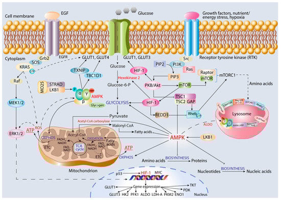To provide cancer cell metabolic plasticity, induction of numerous genes and activation or inhibition of multiple oncogenes, growth factors, and tumor suppressors are required [21]. A crucial role in this phenomenon belongs to interplay between HIF-1 and AMP-activated protein kinase (AMPK), an energy sensor and master regulator of cellular metabolism and bioenergetics. AMPK is a heterotrimeric serine/threonine kinase that is activated in response to decrease in AMP/ATP ratio in order to provide ATP production through both glycolysis and OXPHOS [22]. In general, AMPK maintains ATP level in cells due to a switch from anabolic to catabolic metabolism through the stimulation of glucose uptake, aerobic glycolysis, and mitochondrial oxidative metabolism, mainly due to β-oxidation of fatty acids [23].