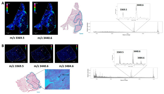 Distribution of the peptides of interest in fresh frozen non-small cell lung cancer (NSCLC) tissues, obtained with matrix-assisted laser desorption/ionization (MALDI) mass spectrometry imaging. (A) In this example of human squamous cell carcinoma lung cancerous tissue with adjacent reference tissue, the interesting peptides are expressed in the nontumor region, highly expressed at the interaction border between the nontumor and the tumor region and a low to no expression deeper in the tumor region; (B) In this example of human adenocarcinoma lung cancerous tissue with adjacent reference tissue, these peptides are also expressed in necrotic regions within the tumor region. These regions were confirmed in the corresponding hematoxylin and eosin (H&E) staining, and performed after the matrix-assisted laser desorption/ionization mass spectrometry imaging (MALDI MSI) experiment on the same tissue section. The overall average mass spectrum of the whole tissue section obtained after MALDI MSI, which is zoomed out at the peptides of interest m/z 3369.5, m/z 3440.6 (and m/z 3484.6), is displayed, of which the corresponding distribution is portrayed in the left part of the figure.