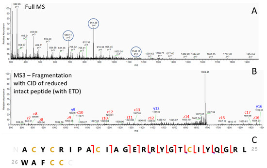 Identification of these three peptides of interest was not possible with top-down peptidomics, as performed earlier for an identification of other MALDI MSI targets with higher-energy collisional dissociation (HCD) [23]. Although the precursors for these peptides could be selected for fragmentation, the corresponding fragmentation spectra did not yield sufficient fragments to allow peptide identification. Since electron-transfer dissociation (ETD) has been used successfully in the past for the identification of naturally occurring peptides [38], we applied ETD as a fragmentation technique instead of HCD. The resulting fragmentation spectra of the three target peptides showed a neutral loss of 3 Da in each peptide (presented in Figure S1B). This possibly corresponds to a reduction of three disulfide bridges between two cysteine residues, as it has been proven that ETD can induce disulfide bond cleavage [39,40,41].