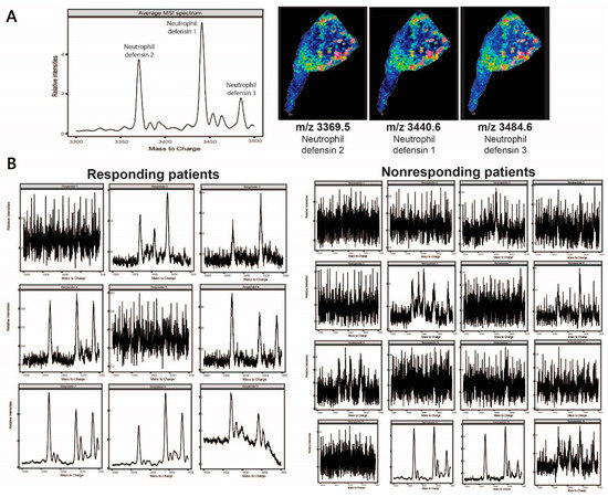 Average MALDI MSI spectra obtained from whole formalin-fixed paraffin-embedded (FFPE) tumor biopsies of NSCLC patients. (A) An example of a resulting average mass spectrum with neutrophil defensin 1, 2 and 3 and their corresponding distribution within the tissue, obtained with MALDI MSI analysis on a FFPE tissue section; (B) Average MALDI MSI spectra of 25 pretreatment tumor FFPE biopsies from NSCLC patients that received anti-PD-(L)1 immunotherapy. From this small patient cohort, nine patients received clinical benefit from the therapy (responders), from which seven patients showed expression of the neutrophil defensins. The other 16 NSCLC patients did not derive any clinical benefit from immunotherapy treatment (nonresponders), from which 14 show no (or very low) neutrophil defensin expression. From the nonresponding patients, two NSCLC patients showed neutrophil defensin expression.