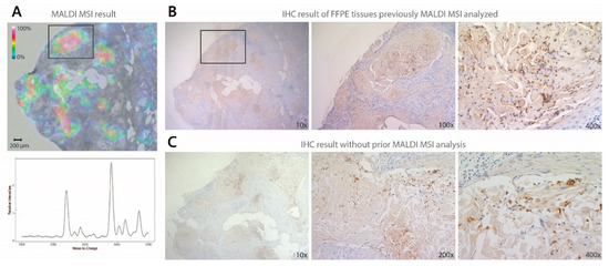 Comparison of defensin 1/3 antibody staining on FFPE tissue sections previously MALDI MSI analyzed and without prior MALDI MSI analysis. (A) Distribution of the three neutrophil defensins in FFPE lung tissue obtained with MALDI MSI. The mass spectrum displays the three neutrophil defensins, while the MSI image only displays the distribution of neutrophil defensin 1 (m/z 3440.6), as neutrophil defensin 1 shows the same distribution as neutrophil defensin 2 (m/z 3369.5) and 3 (m/z 3484.6); (B) Validation of the presence of the neutrophil defensins obtained with MALDI MSI with immunohistochemical (IHC) analysis. The region indicated with the box in the MSI result was compared with the same tissue region after immunohistochemical analysis with the defensin 1/3 antibody; (C) No change in staining intensity is observed compared with the same IHC staining protocol on a consecutive FFPE tissue section with no prior MALDI MSI analysis.