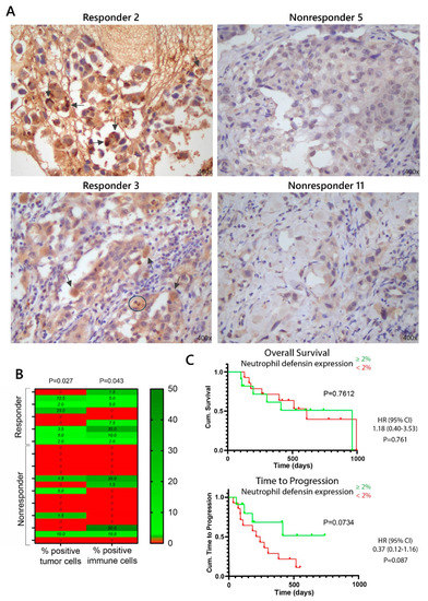 Immunohistochemistry analyses of expression of neutrophil defensin 1/3 on both tumor cells and immune cells in pretreatment tumor biopsies of NSCLC patients who received anti-PD-(L)1 immunotherapy treatment. (A) Example of the IHC staining of two different responding patients and two nonresponding patients to immunotherapy treatment. Few examples of neutrophil defensin expression were indicated by the arrows, and an example of expression on neutrophil granulocyte was encircled. Magnification 400×; (B) The percentage of neutrophil defensin positive cells for each NSCLC patient individually, determined with IHC. A significant difference between responding and nonresponding patients is observed based upon neutrophil defensin expression on both tumor cells (p = 0.027) as on immune cells (p = 0.043), examined with a Mann–Whitney U test; (C) Kaplan–Meier survival curves for overall survival (OS) and time to progression (TTP) according to neutrophil defensin expression: NSCLC patients were grouped by ≥2% (cut-off 2% determined by receiver operating characteristic (ROC) analysis) neutrophil defensin expression on tumor cells and/or immune cells (green) and <2% neutrophil defensin expression (red). Significance was determined using the log-rank test. Hazard ratio (+95% CI) is determined using Cox regression.