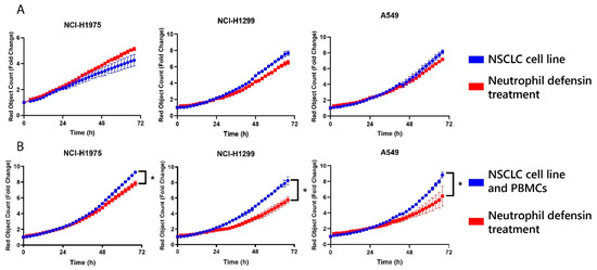 A possible explanation for the contribution of the neutrophil defensins to the immunotherapy response could be an interplay with adaptive immunity [45]. To confirm this hypothesis, cocultures of NSCLC cell lines (NCI-H1975, NCI-H1299 and A549) and peripheral blood mononuclear cells (PBMC) from healthy donors (effector/target (E/T): 10/1) were treated with either three neutrophil defensins or phosphate-buffered saline (PBS) control. Real-time follow-up was assessed. Treatment with neutrophil defensins significantly decreased tumor cell proliferation in all three NSCLC cell lines (p = 0.05, determined after 3 days of treatment), compared to PBMC coculture with PBS control treatment (Figure 6). This effect was most pronounced in NCI-H1299. A conceivable explanation for this observation is immune activation towards cancer cells, as an effect of addition of defensins to the cancer cells was only observed in the presence of PBMC. Direct addition of neutrophil defensins to the three NSCLC cell lines in the absence of immune cells did not result in a significant decrease of tumor cell proliferation, and even an increase in NCI-H1975 cell proliferation was observed (Figure 6A).