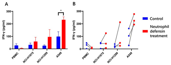 IFN-γ secretion in the supernatants of in-vitro cocultures treated with neutrophil defensin 1, 2 and 3. PBMC alone or cocultured with NSCLC cells (NCI-H1975, NCI-H1299, A549) were treated with neutrophil defensin 1, 2 and 3 (Red, 5 µM) or PBS (Blue, control) for 3 days. Thereafter, supernatants were used to determine the amount of IFN-γ. (A) Means ± SEM of PBMC from three healthy donors after 66 h treatment with neutrophil defensins. This results in a significant increase (* p = 0.05) of IFN-γ concentration for A549; (B) Increase in IFN-γ concentration for each donor individually.