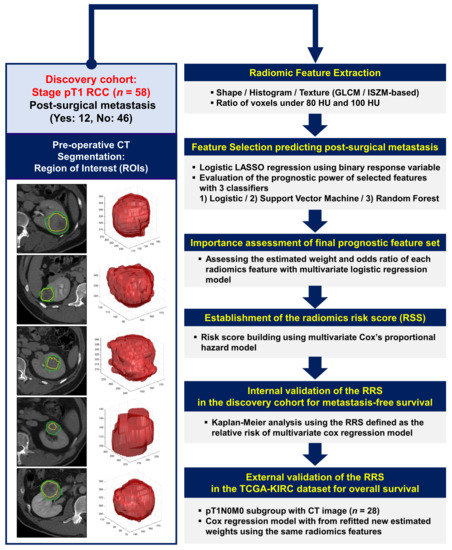For imaging biomarker discovery, all analyses were approved by the appropriate Institutional Review Board at Samsung Medical Center (Seoul, Korea) (IRB No: 2019-09-005) for a retrospective design and waiver of informed consent regarding the acquisition of CT data. The discovery cohort used to construct the RRS consisted of RCC tumors treated with radical or partial nephrectomy between March 2010 and May 2016 at Samsung Medical Center (Seoul, Korea), fulfilling the following inclusion criteria: (1) histopathologic diagnosis of RCC (58 cases: clear cell subtype), (2) stage I based on pathologic findings following the American Joint Committee on Cancer staging manual, eighth edition: T1N0M0 [59], (3) availability of contrast-enhanced abdomen and pelvis CT scan performed prior to surgery, (4) availability of clinical follow-up data regarding postoperative metastasis events and MFS events, and (5) lack of postadjuvant therapy. In total, 58 patients were included, which consisted of 12 cases with postoperative metastasis in common sites [60] (1 case: adrenal gland, 1 case: adrenal gland and pancreas, 2 cases: pancreas, 8 cases: lung parenchyma) and 46 cases with no evidence of disease (Table S1). MFS was measured from the date of surgery to the date of the first clinical evidence of metastasis and was censored at the date of death or the date of the last follow-up visit for survivors.