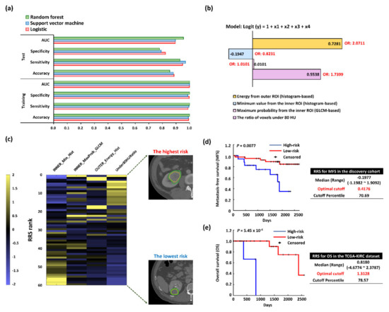 A color-coded heat map was constructed to visualize relationships among the ranges of different individual trait score values, their corresponding composites RRS values, and the binary RRS (high/low RRSs) (Figure 2c). To build a prognostic radiomics model, the analysis was divided into discovery and validation phases (Figure 2d,e). In the discovery cohort, the RRSs of metastasis-free survival (MFS) ranged from –1.1982 to 1.9092 (median: −0.1977), with the optimal cutoff of 0.4176 (70.69%, hazard ratio (HR) = 8.2954, 95% confidence interval (CI) = 2.0957–32.8362, p = 0.0077). In the validation cohort (CT imaging data from the Cancer Genome Atlas Kidney Renal Clear Cell Carcinoma (TCGA-KIRC) dataset, n = 28, Table S2) [20,21], the RRSs of OS ranged from –4.6774 to 2.3787 (median: 0.8180), with the optimal cutoff of 1.3128 (78.57%, HR = 2.2264 × 105, 95% CI = 1.3878 × 103–3.5719 × 107, p = 0.0005).