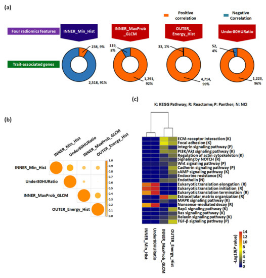 Trait-associated genes and their functional enrichment analysis. (a) Each gene set correlated with four radiomic features in the genomic discovery cohort (n = 11). Genes that were significantly associated with four radiomic features were identified by Spearman’s correlation analysis, of which significantly correlated genes (p < 0.05) were selected. Positive and negative Spearman’s rank correlation coefficients were distinguished by different colors. (b) Heatmap of the similarity between each trait-associated gene calculated by the Jaccard similarity index (coefficient). (c) Heatmap of pathway enrichment of trait-associated genes. Multiple pathway analyses, including Kyoto Encyclopedia of Genes and Genomes (KEGG) Pathway, Reactome, Panther, and National Cancer Institute-Pathway Interaction Database (NCI-PID), were utilized.