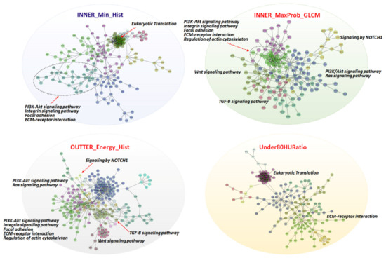Gene–gene interaction network analysis of trait-associated genes. Gene–gene interaction networks visualized for four radiomic features. Functional gene modules are shown in different colors, and major pathways are annotated.