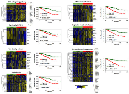 Prognostic significance of major signaling pathways associated with four radiomic features in the genomic validation cohort. The heatmap and Kaplan–Meier curves showing each gene signature score and overall survival difference for high- and low-risk groups via the PI3K/Akt signaling pathway, NOTCH1 signaling, Wnt signaling pathway, focal adhesion, ECM–receptor interaction, regulation of actin cytoskeleton, and extracellular matrix organization.