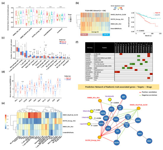 Characterization of subgroups clustered by the expression patterns of trait-associated genes in the genomic validation cohort. (a) Comparison of signature scores of each trait-associated gene according to the stage in the TCGA-KIRC dataset (n = 436). * p < 0.05, ** p < 0.01, *** p < 0.001. (b) Three subgroups (high, intermediate, and low enrichment scores (ESs)) of samples according to the expression patterns of the trait-associated genes in the TCGA-KIRC dataset (n = 436) (left panel). Kaplan–Meier curves of OS are shown for high- and low ESs (right panel). (c) Differences in immune-cell-type proportions between the high and low enrichment of radiomic gene-sets. (d) Differences in checkpoint modulators between the high and low enrichment of radiomic gene-sets. (e) Heatmap of the correlation between each trait-associated gene-set and immune-cell-type proportions/checkpoint modulators. (f) upper panel: Association between candidate drugs and target genes in kidney cell lines from the Cancer Cell Line Encyclopedia (CCLE) dataset. The correlation map of anticancer drugs and genes belonged to major pathways. The red color indicates a positive correlation between gene expression and the half-maximal effective concentration (EC50, corresponding to less effective drug), and the green color indicates a negative correlation between gene expression and EC50 (corresponding to more effective drug). lower panel: Gene–drug–radiomic feature Network. A directed edge between genes represents activation or catalysis, and a dotted edge indicates the predicted functional interaction.