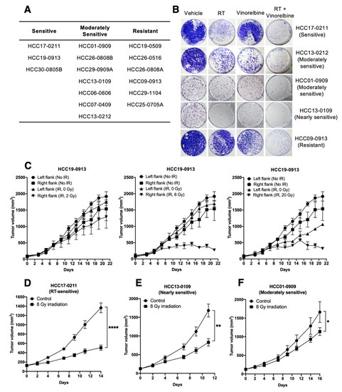 Effects of radiotherapy (RT) on tumor growth in vitro and in vivo. Organoid cultures were prepared as described in Appendix A and subjected to 8 Gy irradiation. Cells were counted 8 days after RT, expressed as percentage of control non-irradiated culture and classified into sensitive, moderately sensitive, or resistant to RT, as described in the Materials and Methods section (A). The indicated cultures were subjected to 0 or 6 Gy irradiation in the absence or presence of 0.05 µM Vinorelbine for 24 h. Representative images of colonies are shown (B). Mice were subcutaneously implanted with HCC19-0913 tumors on both flanks, with the left flank non-irradiated (internal control) and right flank tumor locally irradiated with a single dose of 2, 8, and 20 Gy (n = 6 mice per group); 8 Gy was sufficient to significantly inhibit tumor growth without affecting the internal control and was, therefore, used in subsequent studies (C). Mice implanted with the indicated patient-derived xenograft (PDX) lines were treated with 8 Gy RT (D–F). Tumors were allowed to grow post-irradiation and tumor volumes ± SE plotted (C–F). Mean tumor weight ± SE at the endpoint are shown (D–F). * p < 0.05; ** p < 0.01; **** p < 0.0001, Student’s t-test. SE, standard error of the mean. IR, irradiation.
